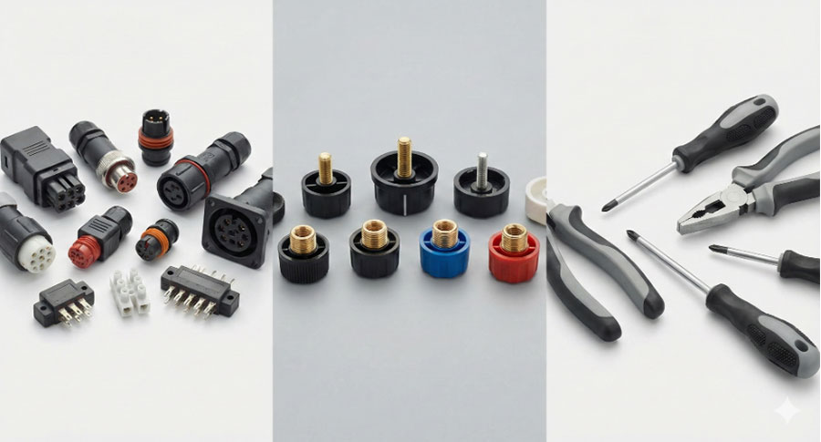 : Waterproof electrical plugs and multi-pin terminal blocks with metal pins securely embedded. -